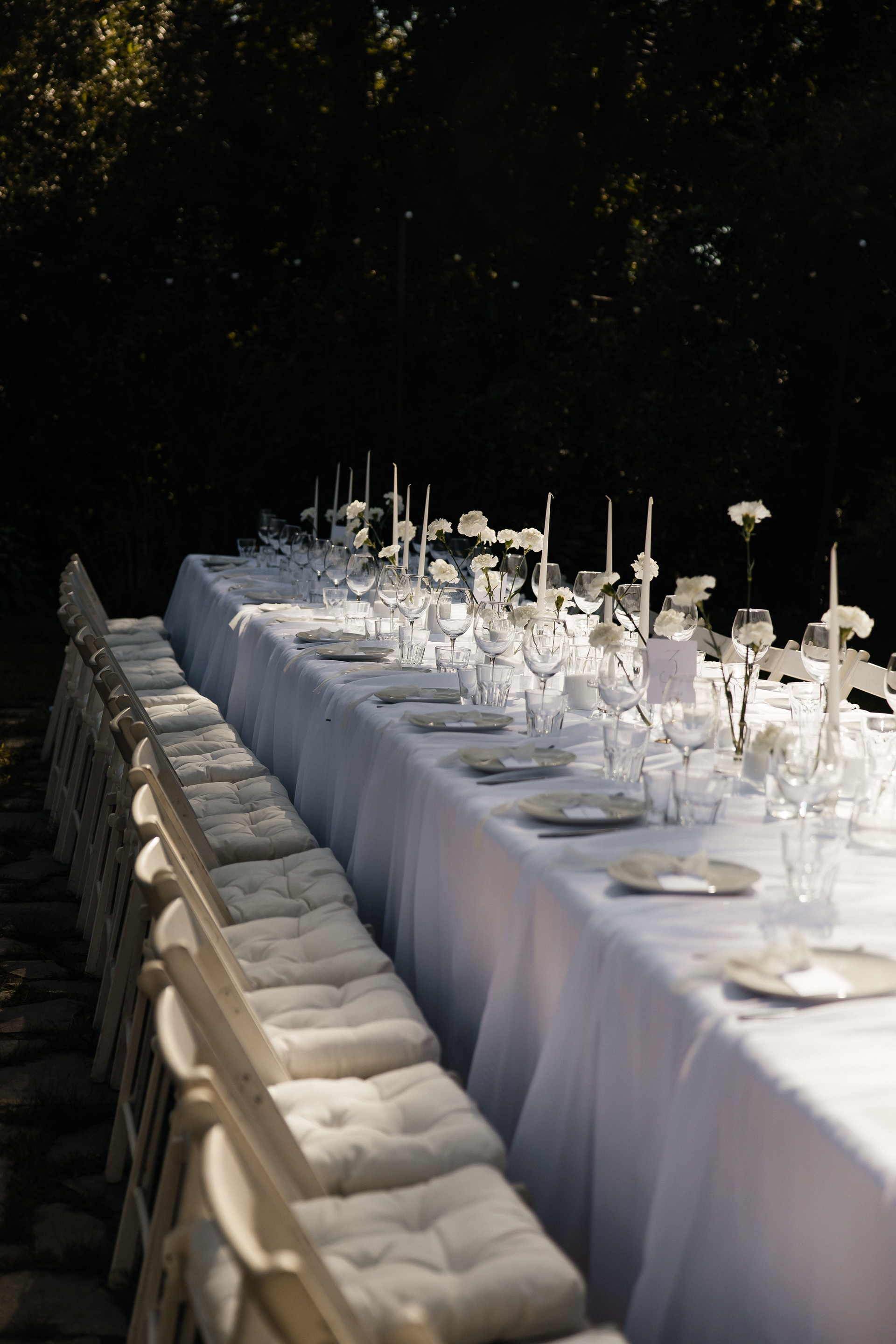 «Я хочу начать рассказ про наш день не с концепции, а с наших ожиданий и мотивов. Да, как и у многих пар у нас была мысль улететь в путешествие (хорошо, что он военный и дальше России нам нельзя выезжать, соблазнов было меньше), но за полгода до свадьбы мы точно утвердились во мнении, что если не сделаем это сейчас, то второго шанса не будет, таких эмоций мы больше никогда не испытаем. И мы искренне захотели разделить этот день с близкими людьми, ценим наши семьи и друзей, решили, что будем счастливы видеть их в день создания семьи. Мы не хотели нагружать свадьбу сложными философскими вещами, лишь показать, что современная свадьба далека от представления многих. Но так вышло, что свадьба стала точным отражением нас, и об этом сказали сами гости, мы и не задумались. Мы свободные, эмоциональные, романтичные, обожаем теплые вечера в кругу близких, но все-таки чуть-чуть авантюристы в хорошем смысле. Такой и стала наша свадьба. Я согласовала с командой не многое, потому что доверяла абсолютно каждому специалисту, пожалуй, это самая быстрая по общему времени подготовка. Для свадьбы мы выбрали загородный дом с живым газоном (туфли я всё равно купила на шпильке), гирляндами и костровой зоной, где и прошла первая часть свадьбы. Здесь звучали самые теплые искренние слова. После мы переместились в дом для жарких танцев.Сборы проходили в доме, наконец-то я утром пила шампанское, но это имело больше терапевтический эффект, чтобы я не контролировала процессы подготовки. Прошла первая встреча с Данилой, мы поплакали, успокоились и пофотографировались. Начали собираться гости. Мы подготовили плёночные фотоаппараты, VHS-камеру для контента от гостей. Конечно, не обошлось без бара и горки шампанского. Особое внимание на свадьбе мы уделили декору, очень ценю эту эстетику. Зона выездной церемонии была отличной от всех в сезоне: наши декораторы прорастили белые диантусы (гвоздики) из газона. Минималистично и одновременно красиво. Да, гвоздики могут быть прекрасны. Стол — мечта организатора. Мы не ставили еду и бутылку на столы, ужин прошел в формате шведского стола. А на столе — скатерти и белая вуаль в пол, свечи, живые цветы и горки из зефира (смотри фото), внимание, голодным никто не остался. На welcome мы сделали закуски «от неё» (фрукты и сыры) и «от него» (мясо и бургеры, лучшее его блюдо). А ещё декораторы очень эстетично оформили зону пожеланий горками из зефира и винограда.Может, мы ещё те нытики, но плакали мы всю церемонию от осознания этого момента, гости тоже. Салфетки наши координаторы по 2 круга ещё не выдавали. Часть свадьбы на улице мы завершили разрезанием торта. Мы задумали на нём свечи в честь создания новой семьи иии…продали первый кусок за предложение полететь на Сахалин. Вторая часть вечера прошла в доме, где мы пели песни и танцевали под гитару, играли в квиз про нас и танцевали, пожалуй, почти до потери пульса. В 00 казалось, что можно праздновать до утра. Теперь я с твердой уверенностью заявляю, что свадьбы нужно играть, проверено лично. Если бы можно было прожить этот день заново, мы бы повторили. Это бесценный день.
