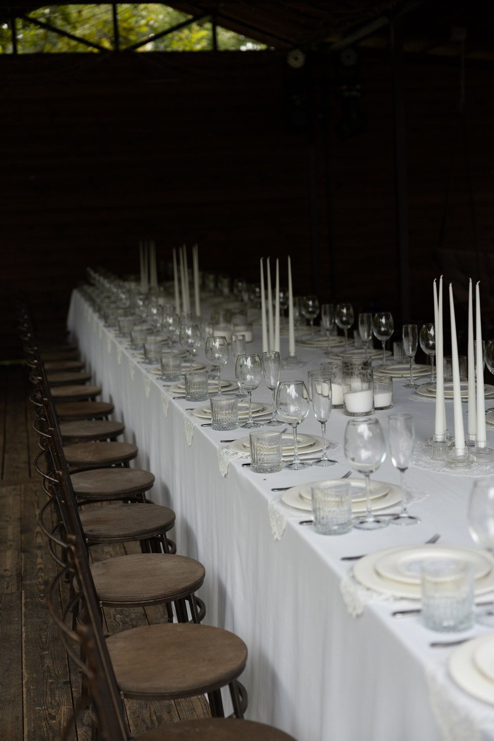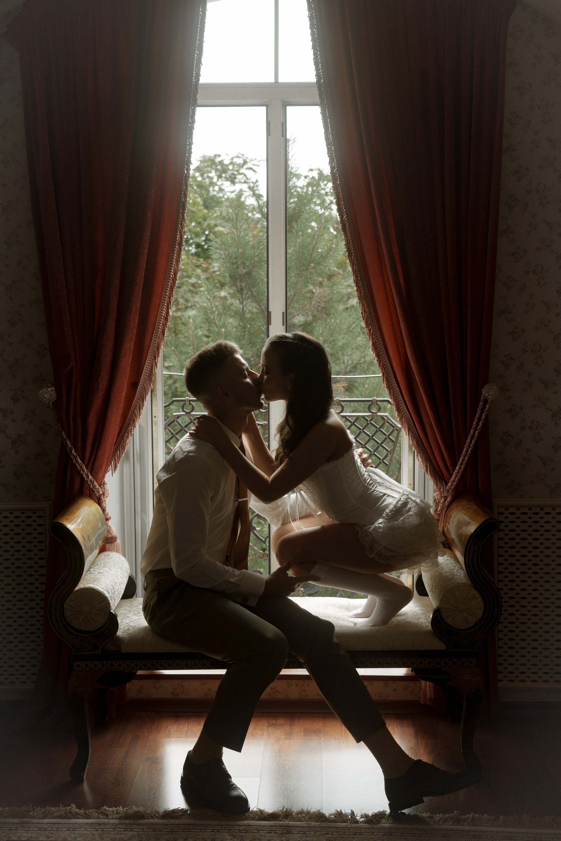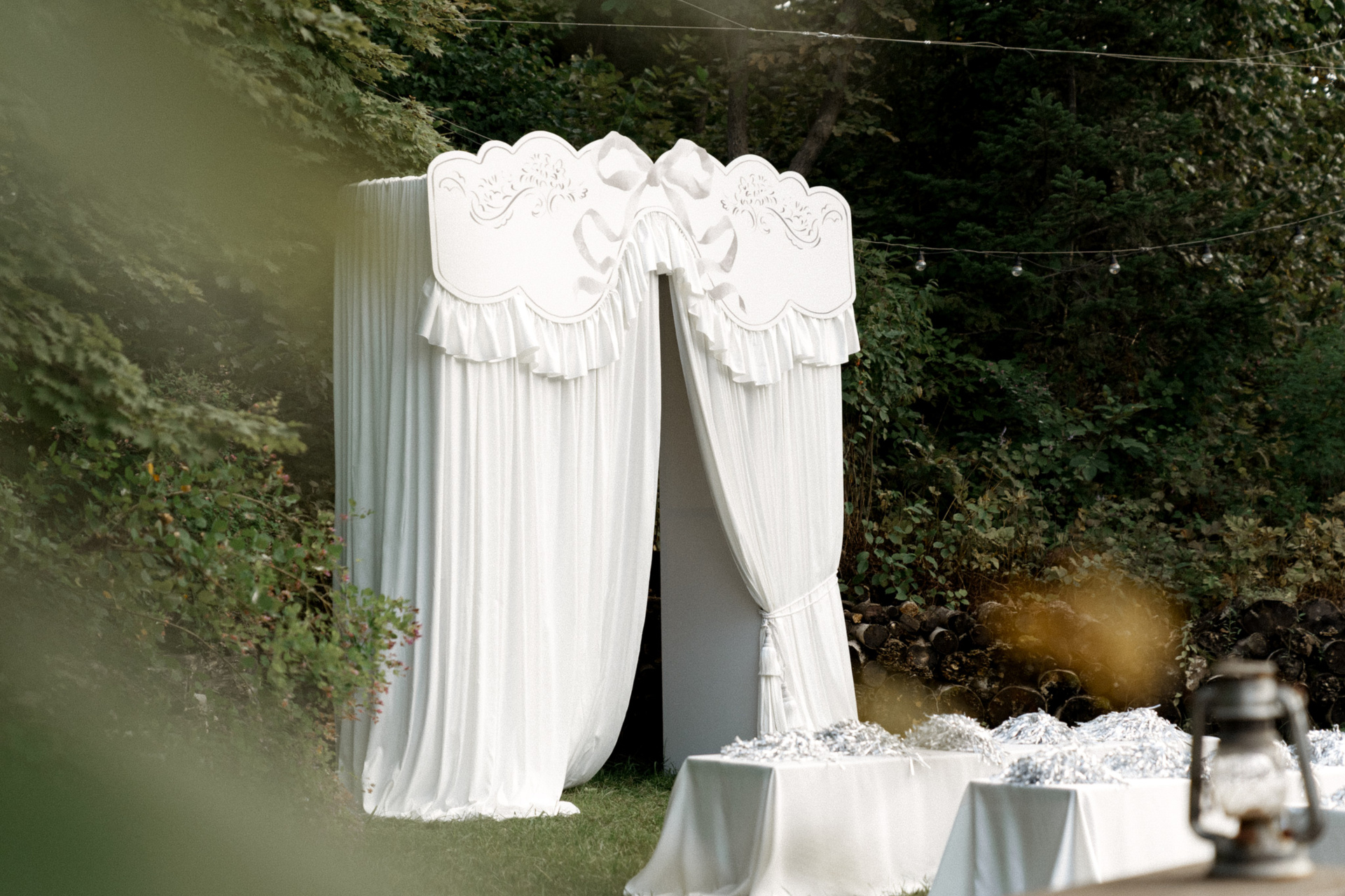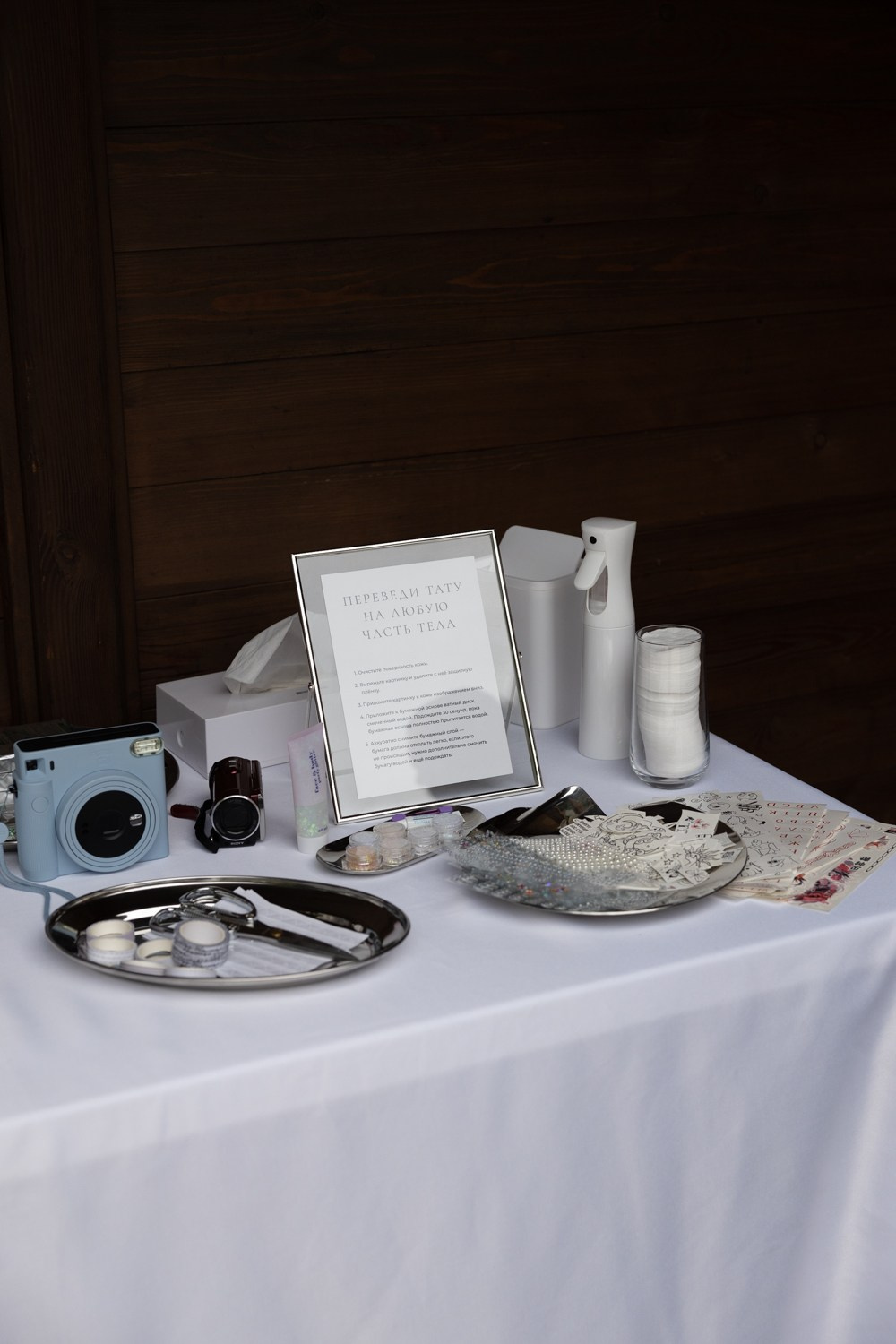 Света мечтала об эстетике «Бриджертон», Никита жаждал настоящей энергии вечеринки, а локация посреди леса казалась вызовом. Но именно из таких «невозможностей» мы создаём то, о чём гости потом говорят: «Вау, а так можно было?» Мы пришли к идее совместить эстетику ренессанса и современность, добавить нотку драйва к празднику. Для сборов выбрали целую усадьбу — с садом, атмосферными залами и спальнями. Это не просто красивая локация, это пространство, где можно спокойно готовиться, не чувствуя спешки или сует. Образы Светы и Никиты мы разработали совместно со стилистом, учли все пожелания, концепции и локации: корсет, пышная юбка, сдержанный, но с ноткой свободы жених. На welcome гости расписывали Аполлона и Афродиту пожеланиями для ребят, переводили татуировки, сияли от глиттер-бара и коктейлей выездного бара, делали фоточки на instax и записывали видео на VHS-камеру. Зона выездной церемонии стала настоящей сценой: благородные ткани, драпировки, кисточки — современная роскошь без избыточности. На столах — множество высоких белых свечей, скатерти строго в пол (мы убеждены, что качество кроется даже в таких деталях), изысканные салфеточки. Интересный факт: позже мы увидели точно такие же на дне рождения у Нюши. На церемонии жениха и невесту поддерживали помпонами — Никита раньше занимался чирлидингом, и это был тот случай, когда личная история становится частью сценария. Ведущий выдерживал баланс трогательности и юмора. После поздравлений вечеринка набирала обороты: появился праздничный гардероб для гостей со шляпами, пиджаками, очками, галстуками, гостям раздали пистолеты с мыльными пузырями. Света и Никита разрезали огромный торт, Свете пришлось встать на лестницу на фоне фонтана искр. И как вечеринка может закончиться в десять вечера? В программе after-party: бирпонг, егерь-бочка и жаркие танцы в патибасе (фотографий нет, но поверьте, там было очень весело, мы проверили).